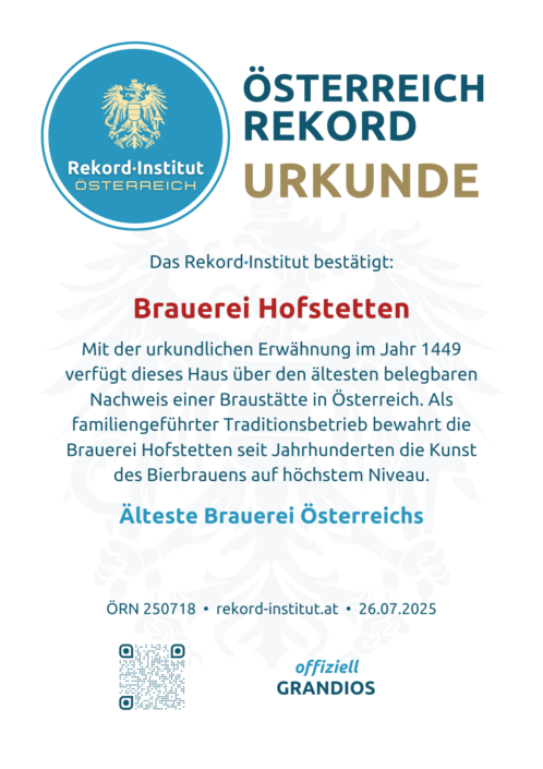Die Brauerei Hofstetten würdigt die längste belegbare Tradition der Braukunst in Österreich. Sie ist ein lebendiges Denkmal der Wirtschaftsgeschichte und hält mit Stolz das älteste Brauereizeugnis des Landes. Damit ist Hofstetten offiziell eine grandiose Besonderheit unserer Heimat.