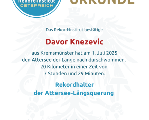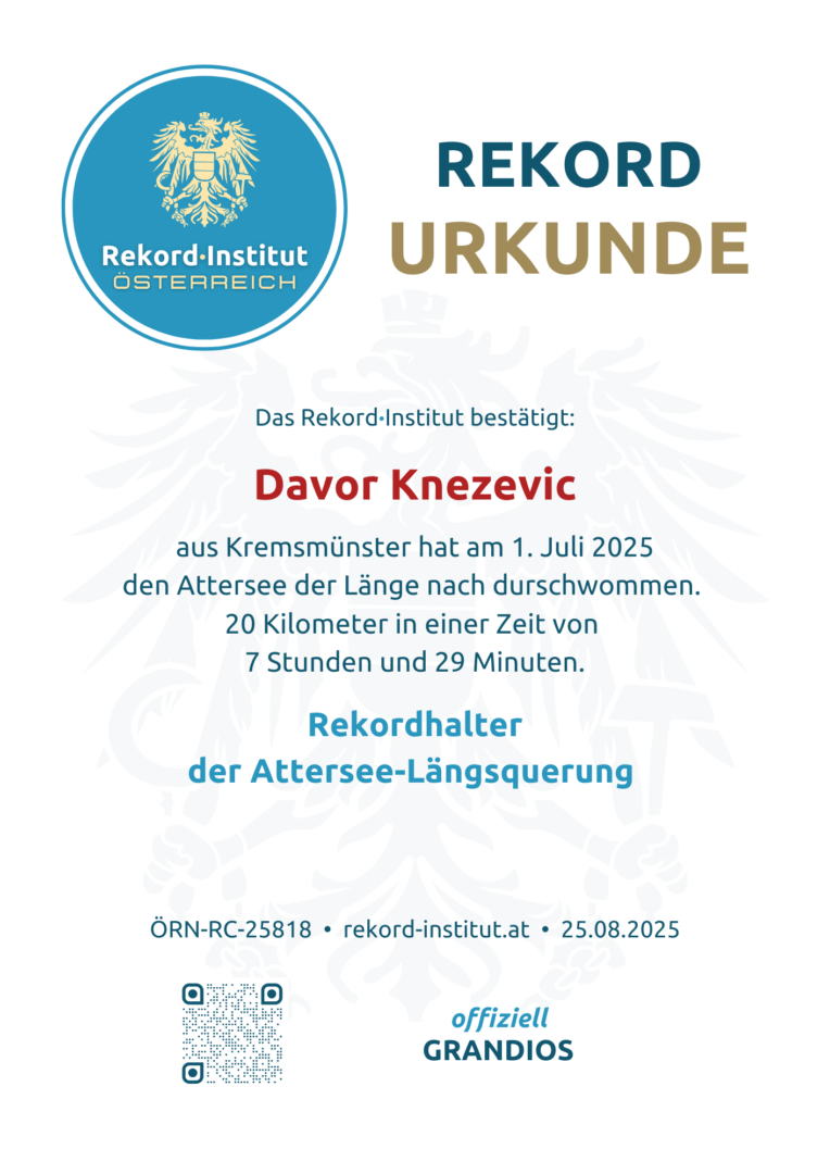 Die gesamte Länge des größten Sees Österreichs zu durchschwimmen, ist ein unvergesslicher Triumph über die Distanz. Diese monumentale Leistung von Davor Kenzevic dient als neuer Maßstab in der Geschichte des Freiwasserschwimmens und ist eine offiziell grandiose Bestätigung dafür, dass Authority im Sport vor allem im Kopf entsteht. Ein stolzer Rekord für Oberösterreich.