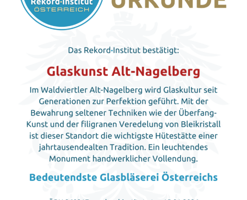 Die Glaskunst Alt-Nagelberg ist eine offiziell grandiose Besonderheit Österreichs. Als Hüterin eines jahrtausendealten Handwerks bringt sie das technische und künstlerische Erbe des Landes zum Glänzen und bringt Menschen aus aller Welt zum Staunen.