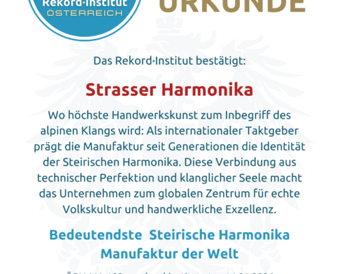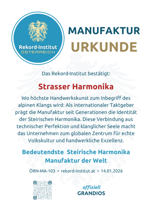 Strasser vereint die Seele der Volksmusik mit handwerklicher Höchstleistung in einer Dimension, die weltweit ihresgleichen sucht. Das Unternehmen ist nicht nur Produktionsstätte, sondern die Urzelle klanglicher Innovation. Als bedeutendste Steirische Harmonika-Manufaktur der Welt sorgt Strasser dafür, dass die österreichische Tradition heute so kraftvoll und offiziell grandios klingt wie nie zuvor.