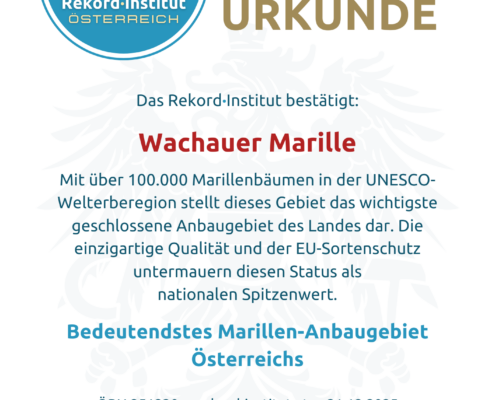 Was die Wachauer Marille zum offiziellen Rekordhalter macht, ist ihre Einzigartigkeit im europäischen Raum. Als eine von wenigen Obstsorten genießt sie den Schutz der EU als „geschützte Ursprungsbezeichnung“ (g.U.). Mit einer Dichte von über 100.000 Bäumen auf engstem Raum zwischen Melk und Krems untermauert die Wachau ihren Status als das Bedeutendste Marillen-Anbaugebiet Österreichs. Dieser nationale Spitzenwert wird durch die jahrhundertealte Tradition der Marillenbauern gesichert.