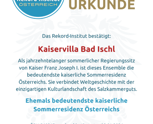 Über sechs Jahrzehnte lang war die Kaiservilla in Bad Ischl weit mehr als nur ein prachtvolles Domizil im Salzkammergut. Zwischen 1854 und 1914 diente sie Kaiser Franz Joseph I. als sommerlicher Regierungssitz, an dem Weltgeschichte geschrieben wurde. Aufgrund der dokumentierten Dauer der kaiserlichen Präsenz und der Tragweite der dort getroffenen Entscheidungen zertifiziert das Rekord-Institut Österreich die Kaiservilla offiziell als die ehemals bedeutendste kaiserliche Sommerresidenz des Landes.