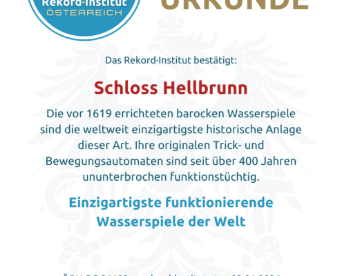 Die Wasserspiele Hellbrunn sichern sich den Weltrekord-Titel durch ihre beispiellose Originalität und Funktionalität. Sie sind ein unvergleichliches Denkmal technischer Meisterschaft, deren Beständigkeit über vier Jahrhunderte weltweit ungeschlagen ist. Damit ist Hellbrunn offiziell eine grandiose Besonderheit unserer Heimat mit globaler Strahlkraft.