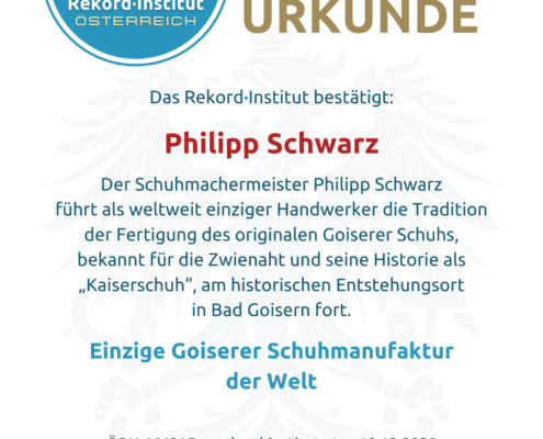 „Die Zertifizierung als ‚Einzige Goiserer Schuhmanufaktur der Welt‘ stützt sich auf die exklusive Bewahrung der originalen Fertigungstechnik des zwiegenähten Maßschuhs am historischen Ursprungsort Bad Goisern.