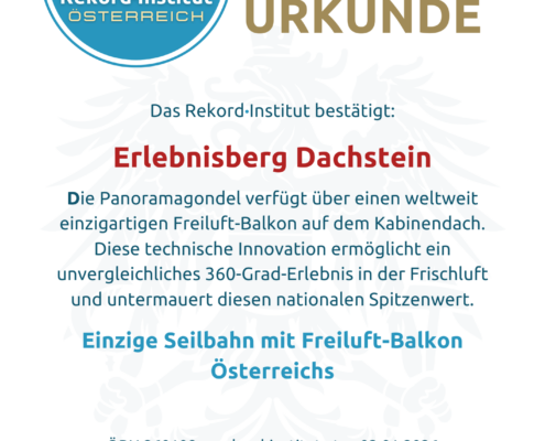 Was den Erlebnisberg Dachstein zum offiziellen Rekordhalter macht, ist das Konstruktionsdetail der Kabinen. Als einzige Seilbahn des Landes bietet sie Fahrgästen die Möglichkeit, die Fahrt auf einem Freiluft-Balkon auf dem Dach zu verbringen. Diese exklusive Form der Beförderung und das damit verbundene 360-Grad-Panorama untermauern den Status als Einzige Seilbahn mit Freiluft-Balkon Österreichs.
