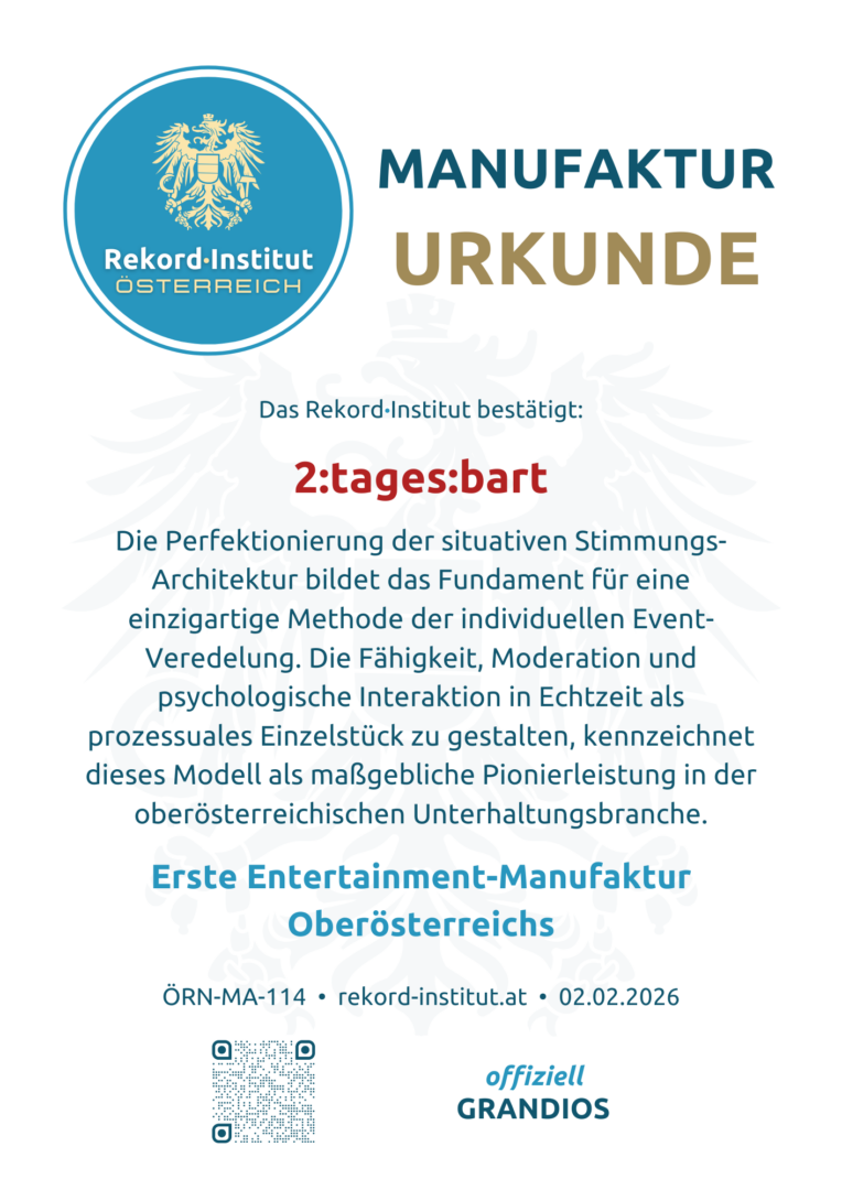 2:tages:bart beweist eindrucksvoll, dass wahre Begeisterung auf meisterlicher Handarbeit und prozessualer Meisterschaft beruht. Durch die Zertifizierung als Erste Entertainment-Manufaktur Oberösterreichs wird ein Modell gewürdigt, das Live-Entertainment als ganzheitliche Manufaktur-Leistung definiert und die Kunst der Publikumsführung in den Status offiziell grandioser Event-Ikonen erhebt.