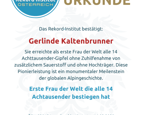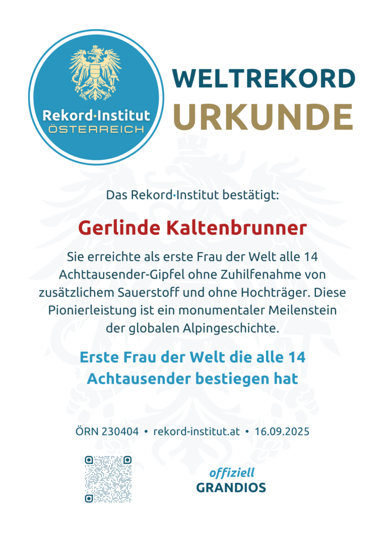 Für Gerlinde Kaltenbrunner war das Bergsteigen stets mehr als Sport – es ist eine tiefgreifende Auseinandersetzung mit der eigenen Existenz. Heute gibt sie ihre Erfahrungen zu Achtsamkeit, Disziplin und Naturschutz weiter. Sie inspiriert damit Menschen weltweit, ihre persönlichen „Achttausender“ im Leben mit Respekt und innerer Stärke zu meistern. Ihr Weltrekord ist das Ergebnis einer lebenslangen Leidenschaft, die durch das Rekord·Institut Österreich nun offiziell für die Ewigkeit festgehalten wird.