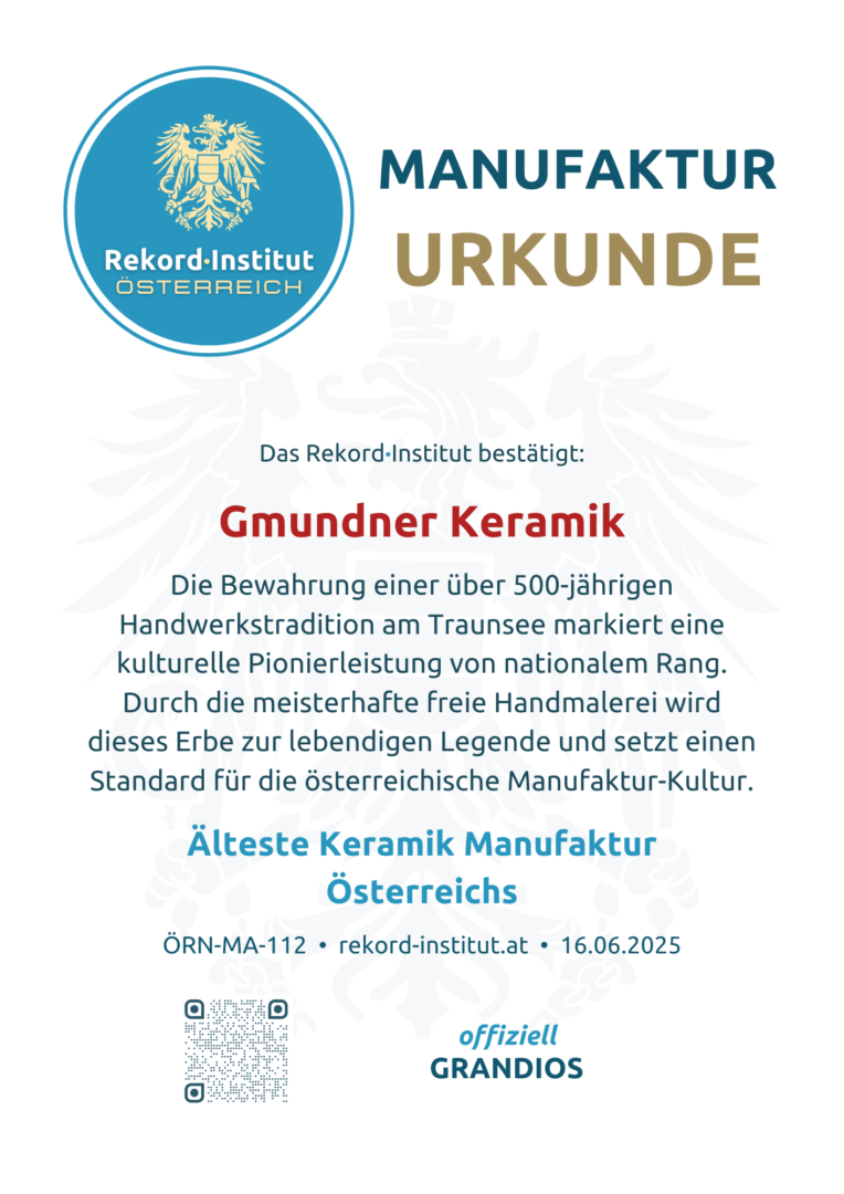 Gmundner Keramik beweist eindrucksvoll, dass wahre Innovation in der kompromisslosen Treue zum Handwerk liegt. Durch die Zertifizierung als Älteste Keramik Manufaktur Österreichs wird ein Unternehmen gewürdigt, das eine jahrhundertealte Tradition offiziell grandios in die Moderne geführt hat und die Symbiose aus Bodenständigkeit und Exzellenz in den Status einer unsterblichen Kultur-Ikone erhebt.