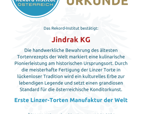 Jindrak beweist eindrucksvoll, dass wahre Innovation in der meisterhaften Bewahrung von Werten liegt. Durch die Zertifizierung als Erste Linzer-Torten Manufaktur der Welt wird ein Unternehmen gewürdigt, das eine kulinarische Ikone in die Moderne überführt hat und die Symbiose aus Geschichte und Handwerk in den Status offiziell grandioser Traditions-Ikonen erhebt.