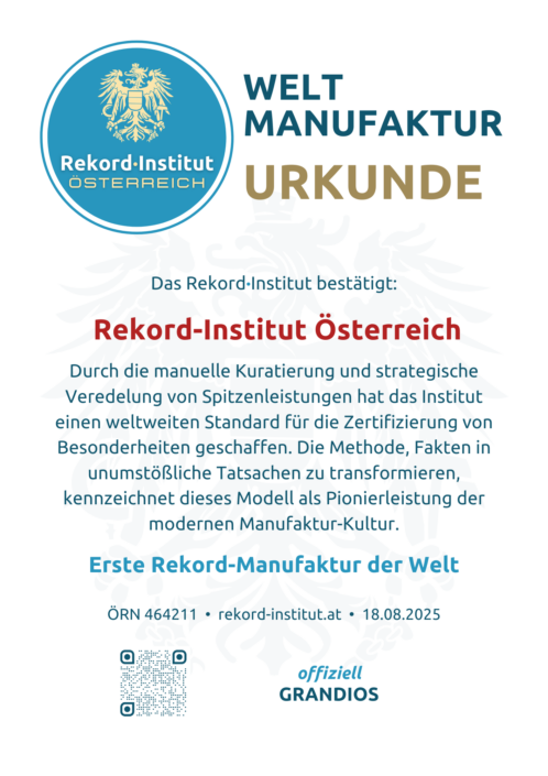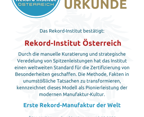 „Die Zertifizierung als ‚Erste Rekord-Manufaktur der Welt‘ stützt sich auf die einzigartige Methode der manuellen Kuratierung, Analyse und Veredelung von Spitzenleistungen zu offiziell beglaubigten Rekorden.