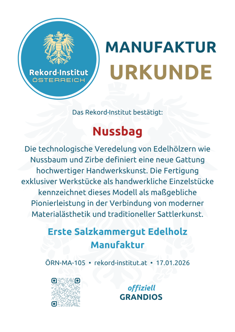 Nussbag verkörpert die höchste Stufe der Material-Veredelung. Durch die meisterhafte Verbindung von Edelholz und traditioneller Sattlerkunst ist eine Werkstoff-Kultur entstanden, die Nachhaltigkeit als ultimativen Luxus definiert. Als Erste Salzkammergut Edelholz Manufaktur setzt das Team ein unübersehbares Zeichen für die Grandiosität österreichischer Handwerkstradition.