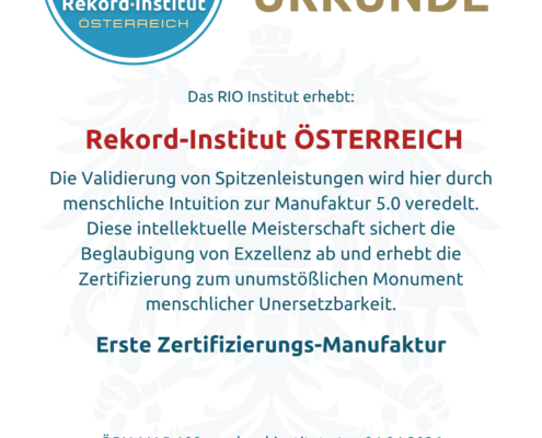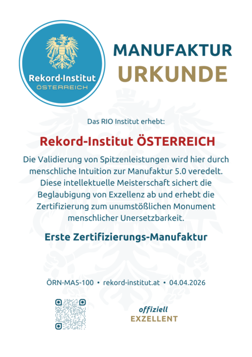 Das Rekord·Institut ÖSTERREICH (RIO) beweist eindrucksvoll, dass wahre Innovation in der Rückkehr des Menschen als Dirigent liegt. Durch die Zertifizierung als Erste Zertifizierungs-Manufaktur wird ein Modell gewürdigt, das den Standard der Manufaktur 5.0 © begründet und Spitzenleistungen als beseelte Gesamtkunstwerke in den Status offiziell grandioser Meilensteine erhebt.