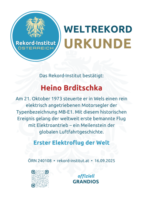 Der Flug von Heino Brditschka am 21. Oktober 1973 ist eine historische Meisterleistung. Als erster bemannter Elektroflug der Welt ist er ein Meilenstein der globalen Ingenieurskunst. Damit ist diese Pioniertat offiziell eine grandiose Besonderheit unserer Heimat und der gesamten Luftfahrtgeschichte.