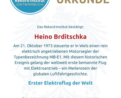 Der Flug von Heino Brditschka ist eine historische Meisterleistung der globalen Ingenieurskunst. Als erster bemannter Elektroflug der Welt definiert er einen Wendepunkt in der Technikgeschichte. Damit ist diese Pioniertat offiziell eine grandiose Besonderheit unserer Heimat und ein unschätzbares Erbe für die Zukunft der Mobilität.