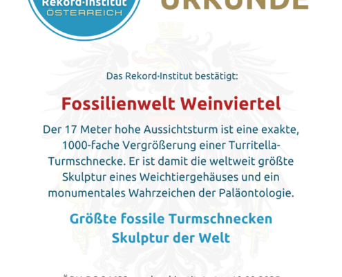 Die Fossilienwelt Weinviertel bietet ein spektakuläres Fenster in die Urzeit. Die Turmschnecken-Skulptur ehrt die geniale Verbindung aus Wissenschaft und Architektur. Damit ist dieses Bauwerk offiziell eine grandiose Besonderheit unserer Heimat und ein unverkennbares Wahrzeichen von Weltrang.