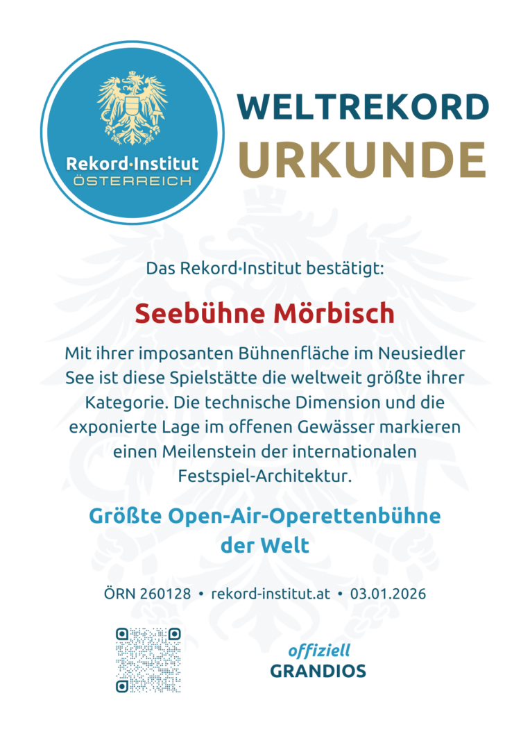 Die Seebühne Mörbisch ist ein Juwel der Architektur und der Kunst. Der Titel Größte Open-Air-Operettenbühne der Welt ehrt die beeindruckenden Dimensionen und die kulturelle Strahlkraft dieses Ortes. Dies macht die Bühne zu einer offiziell grandiosen Besonderheit, die weltweit ihresgleichen sucht.