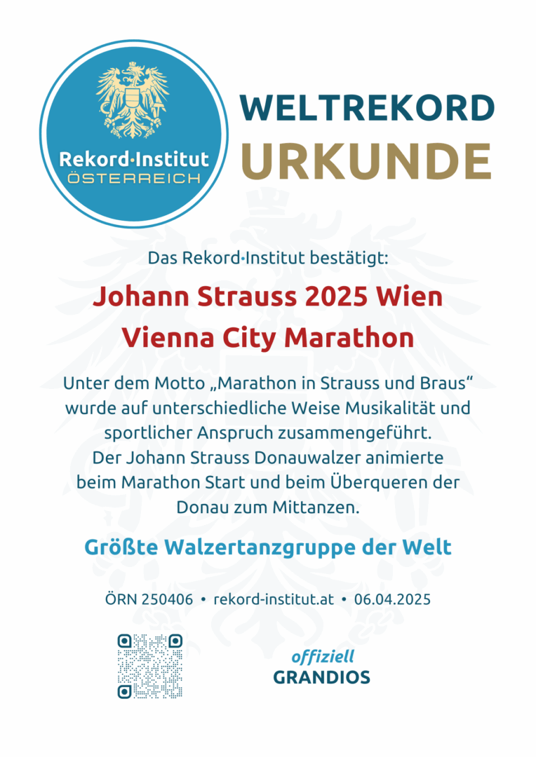 Am 6. April 2025 wurde Wien zur größten Tanzfläche der Welt. Im Rahmen des Vienna City Marathons und einer Idee von „Johann Strauss 2025 Wien“ wurde ein Stück österreichische Kulturgeschichte geschrieben: Der Weltrekord für die „Größte Walzertanzgruppe“ wurde eindrucksvoll in die Heimat des Walzerkönigs geholt.