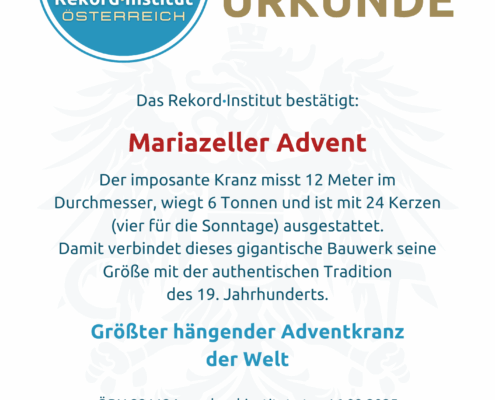 Der Mariazeller Adventkranz verbindet auf einzigartige Weise eine beeindruckende, weltrekordverdächtige Größe mit tiefer historischer Authentizität. Er ist nicht nur ein gigantischer Blickfang, sondern auch ein Symbol für die ursprüngliche Bedeutung des Advents. Eine wahrhaft offiziell grandiose Besonderheit.