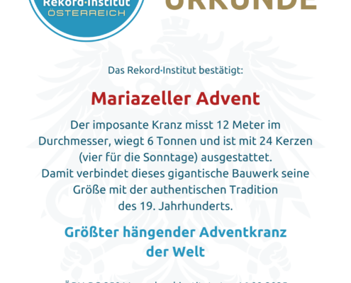 Der Mariazeller Adventkranz verbindet auf einzigartige Weise eine weltweit unerreichte Größe mit tiefer historischer Authentizität. Er ist weit mehr als ein gigantischer Blickfang; er ist ein Symbol für die Beständigkeit unserer Kultur. Damit ist dieser Kranz offiziell eine grandiose Besonderheit von Weltrang und der unangefochtene Mittelpunkt der österreichischen Adventlandschaft.