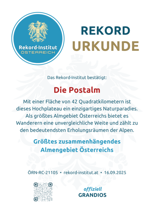 Dieser Rekord wird durch die enorme zusammenhängende Fläche begründet, die in dieser Dimension im Alpenraum einzigartig ist. Über 2.000 Tiere – darunter Rinder, Pferde und Schafe – beleben in den Sommermonaten die saftigen Hochweiden und bewahren so eine Kulturlandschaft, die bereits Kaiserin Elisabeth zu schätzen wusste. Die Postalm ist damit nicht nur ein geografischer Spitzenwert, sondern ein lebendiges Denkmal der österreichischen Almwirtschaft, das die traditionelle Bewirtschaftung in einer monumentalen Dimension fortführt.