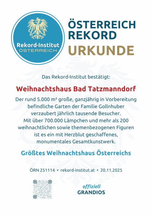 Das Weihnachtshaus Bad Tatzmannsdorf ist weit mehr als nur Dekoration. Es ist ein monumentales, mit Herzblut geschaffenes Gesamtkunstwerk, das die Freude und den Zauber der Weihnachtszeit für jeden greifbar macht. Die schiere Größe und die liebevolle Detailverliebtheit machen es zu einer offiziell grandiosen Besonderheit Österreichs.