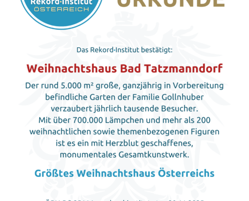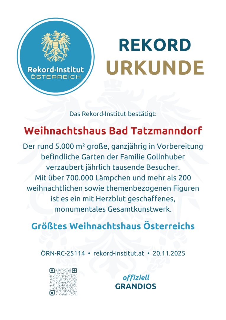 Das Weihnachtshaus Bad Tatzmannsdorf ist weit mehr als nur Dekoration; es ist ein mit unendlichem Herzblut geschaffenes Gesamtkunstwerk. Die außergewöhnliche Größe und die liebevolle Detailverliebtheit machen dieses Anwesen zu einer offiziell grandiosen Besonderheit unserer Heimat. Ein strahlendes Juwel, das den Zauber der Weihnacht für jeden Besucher greifbar und unvergesslich macht.