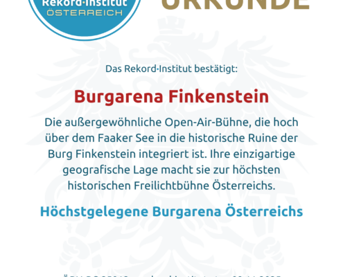 Die Burgarena Finkenstein ist eine meisterhafte Symbiose aus historischem Erbe und lebendiger, moderner Kultur. Der Titel „Höchstgelegene Burgarena Österreichs“ würdigt die spektakuläre Lage und die beeindruckende Nutzung dieses Kärntner Wahrzeichens. Damit bringt sie die heimische Kulturlandschaft international zum Strahlen und ist offiziell eine grandiose Besonderheit unserer Heimat.