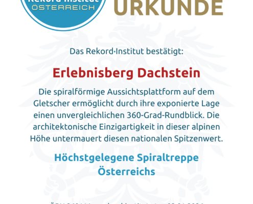 Diese Konstruktion krönt das Erlebnis auf dem Gletscher. Der Titel ehrt die visionäre Bauweise und das einzigartige Panorama. Damit ist die Gletscher-Spirale offiziell eine grandiose Besonderheit unserer Heimat.