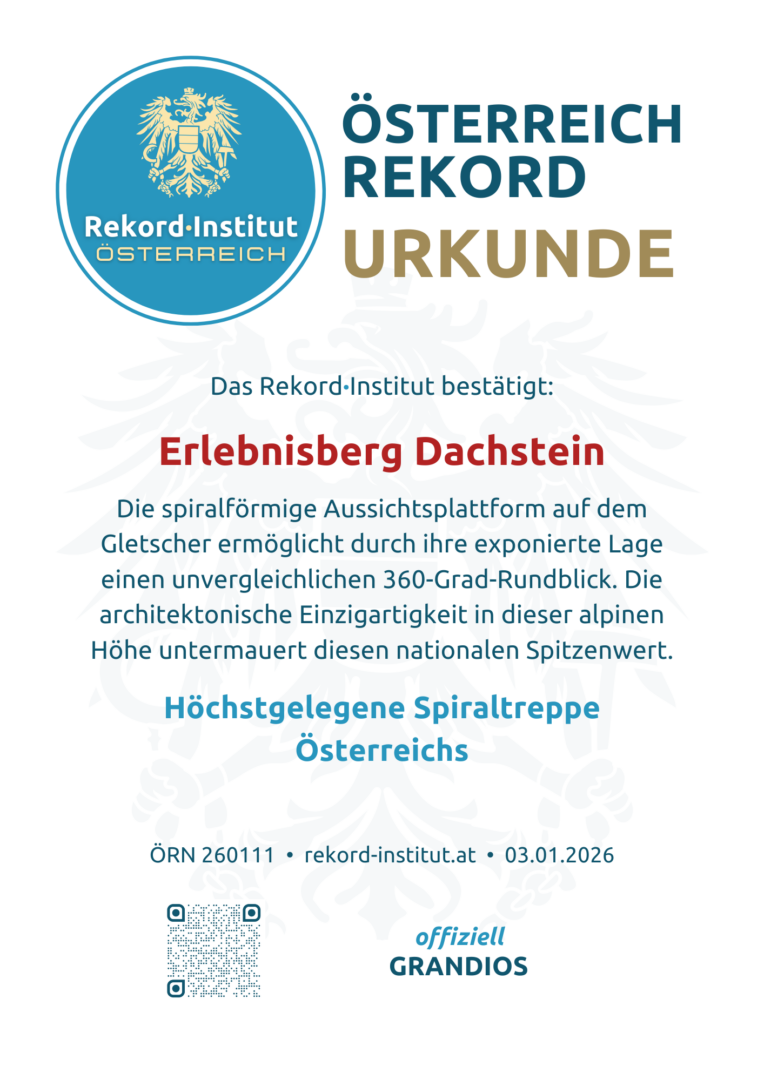 Die Gletscher-Spirale ist ein unverkennbares Symbol für die dynamische Weiterentwicklung des Erlebnisbergs Dachstein. Sie ist ein monumentales Zeugnis dafür, wie Architektur die Schönheit der Alpen unterstreichen kann, ohne mit dem Element Eis verwechselt zu werden. Ein offiziell zertifizierter Spitzenwert des RIO.