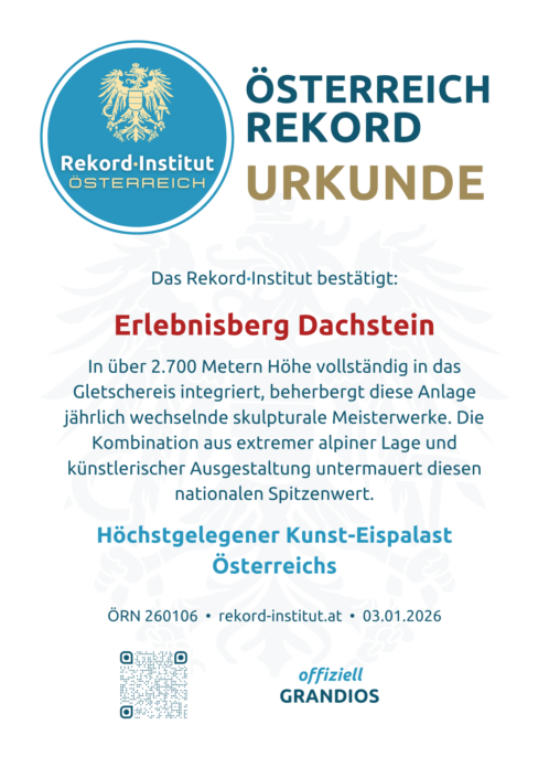 Der Dachstein Eispalast bietet eine unvergleichliche Atmosphäre der Stille und Schönheit. Der Titel ehrt die logistische und künstlerische Leistung in dieser extremen Höhe. Damit ist der Eispalast offiziell eine grandiose Besonderheit unserer Heimat.