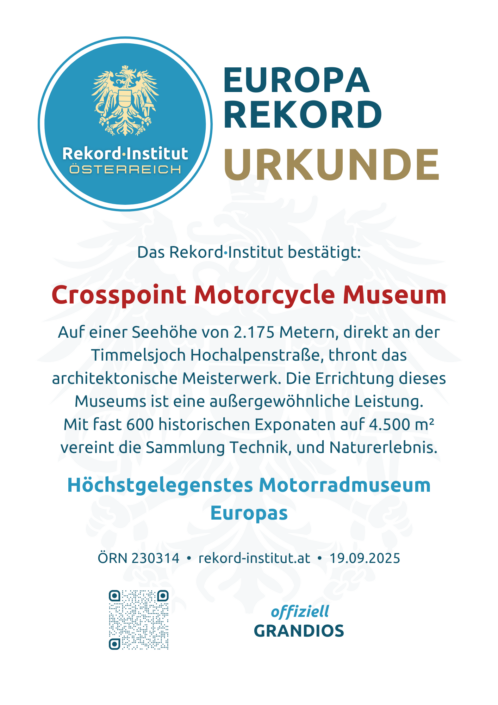 Der Top Mountain Crosspoint ist eine geniale Symbiose aus visionärer Architektur, hochalpiner Kulisse und einer einzigartigen Leidenschaft für die Geschichte des Motorrads. Die Errichtung eines Museums dieser Qualität auf über 2.000 Metern ist eine außergewöhnliche Leistung. Es ist eine offiziell grandiose Besonderheit, die Technik, Genuss und Naturerlebnis perfekt vereint.