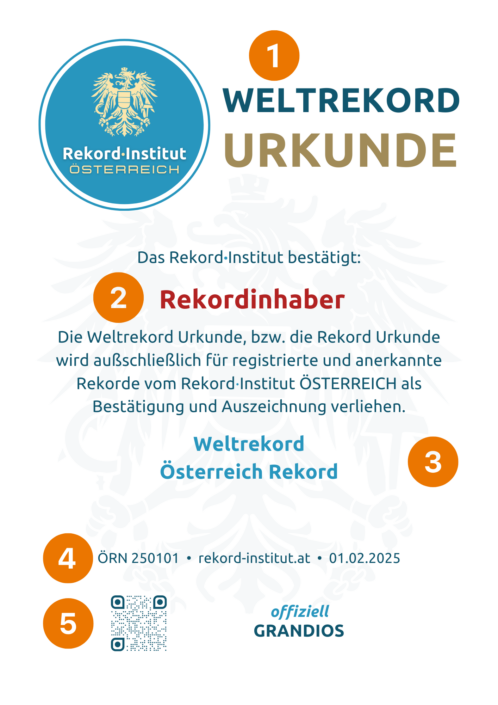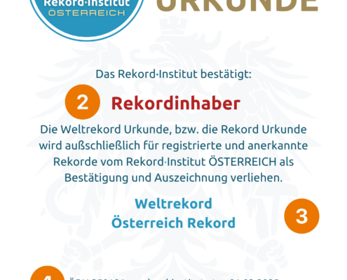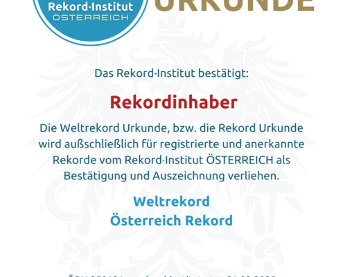 - Zusendung der offiziell grandiosen Rekord Urkunde mit Rahmen in A4 per österreichischer Post