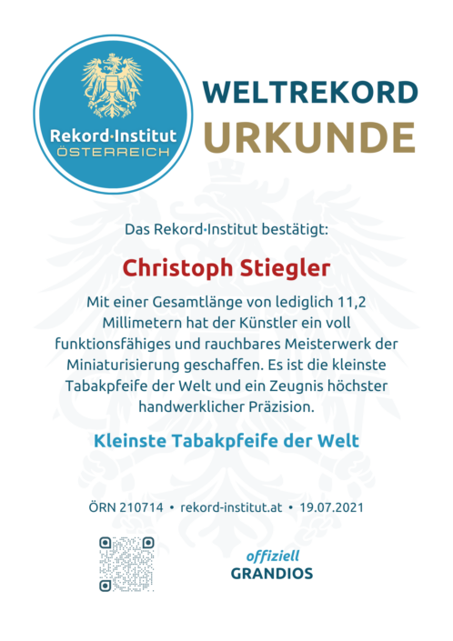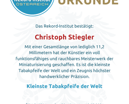 Christoph Stiegler aus Öhling (Niederösterreich) ist ein Meister des feinen Handwerks, der die Grenzen des Machbaren neu definiert hat. Mit einer unglaublich winzigen, aber dennoch voll funktionsfähigen und rauchbaren Tabakpfeife sicherte er sich den offiziell zertifizierten Weltrekord. Dieses Objekt ist ein Beweis dafür, dass wahre Handwerkskunst keine physische Größe braucht, um eine monumentale Wirkung zu erzielen.