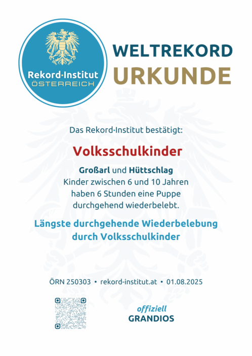 Am 1. August 2025 bewiesen rund 200 Volksschulkinder aus Großarl und Hüttschlag eindrucksvoll, dass Mut und Hilfsbereitschaft keine Frage des Alters sind. Im Rahmen des Großarler Dorffests stellten sie mit der längsten jemals von Kindern durchgeführten Wiederbelebungsstaffel – exakt sechs Stunden lang – einen neuen, offiziellen Weltrekord auf.