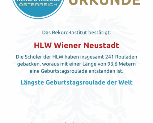 Die Schülerinnen und Schüler der HLW Wiener Neustadt nicht nur Backtalent, sondern auch ein großes Herz bewiesen. Mit unglaublichen 241 einzeln gebackenen Rouladen schufen sie die längste Geburtstagsroulade der Welt mit einer offiziell vom RIO vermessenen Gesamtlänge von 93,6 Metern.