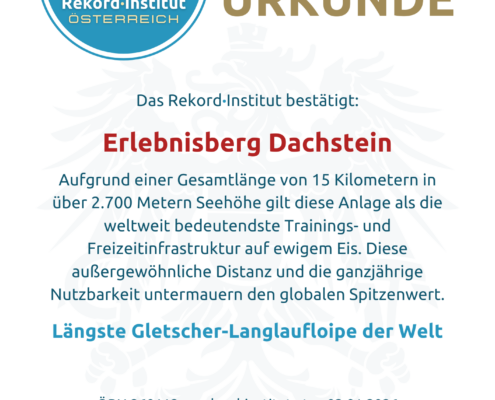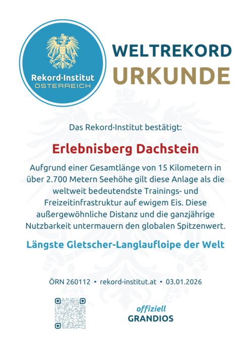 Der Dachstein bietet die ultimative Strecke für Ausdauer und Technik. Der Titel ehrt die Einzigartigkeit dieser Infrastruktur auf globalem Niveau. Damit ist die Gletscherloipe offiziell eine grandiose Besonderheit unserer Heimat und der Welt.