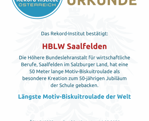 Anlässlich ihres 50-jährigen Bestehens hat die Höhere Bundeslehranstalt für wirtschaftliche Berufe (HLW) Saalfelden am 21. Juni 2024 eine süße Meisterleistung vollbracht. Schülerinnen, Schüler und Lehrkräfte schufen gemeinsam die längste Motiv-Biskuitroulade der Welt mit einer offiziell vom RIO vermessenen Gesamtlänge von exakt 50 Metern.