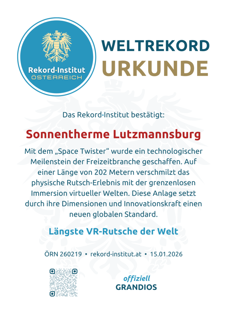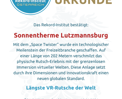 Die Sonnentherme Lutzmannsburg hat mit diesem Projekt einen dauerhaften und grandiosen Meilenstein geschaffen. Die „Space Twister“ ist eine offiziell grandiose Besonderheit Österreichs mit weltweiter Strahlkraft.