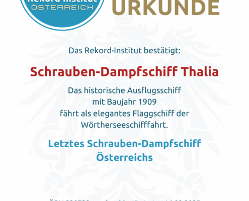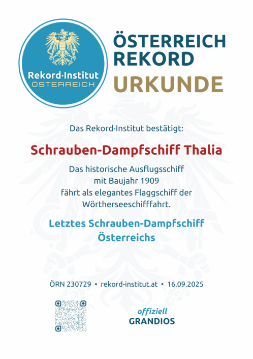 Das letztes Schrauben-Dampfschiff Österreichs – anerkannt durch das Rekord-Institut ÖSTERREICH (RIO).