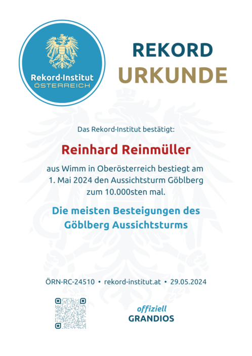 Reinhard Reinmüller hat mit seiner 10.000sten Besteigung eine unvorstellbare Lebensleistung erbracht. Der Titel „Meiste Besteigungen des Göblberg Aussichtsturms“ ehrt die konsequente Disziplin und den unbändigen Willen zur täglichen Bewegung. Damit ist dieser Weltrekord offiziell eine grandiose Besonderheit unserer Heimat und ein Vorbild für alle Generationen.