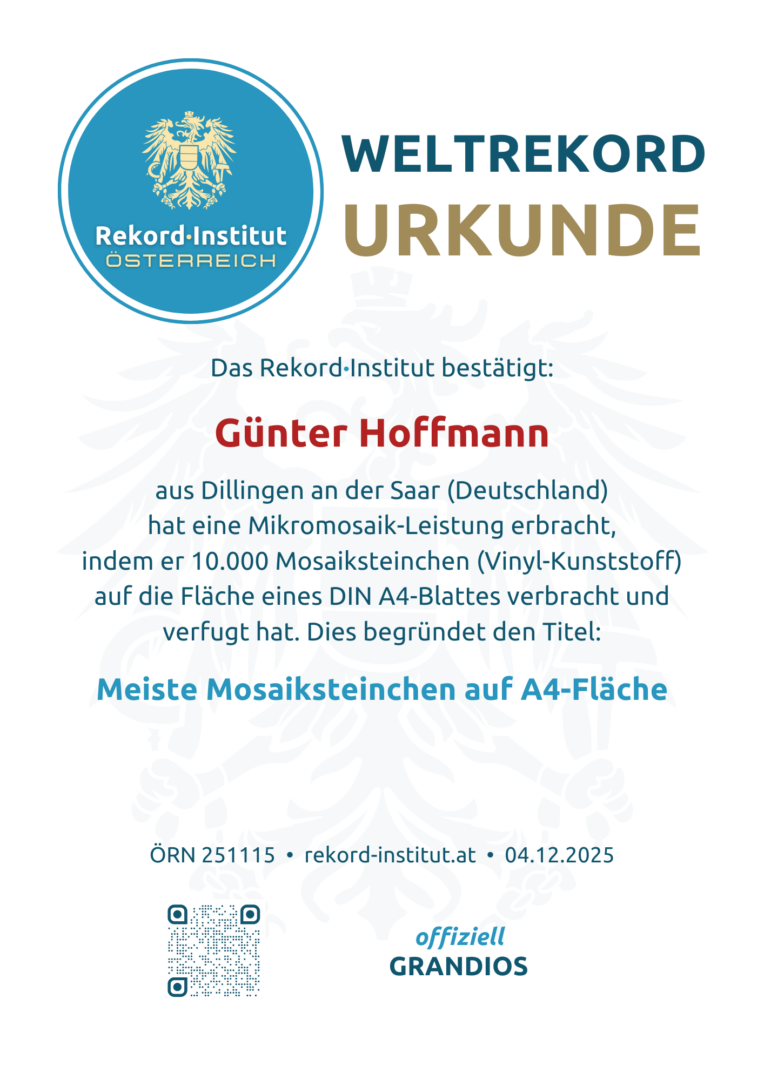 Günter Hoffmann aus Dillingen an der Saar (Deutschland) hat mit einer außergewöhnlichen Präzisionsarbeit einen Weltrekord aufgestellt, der die Grenzen der Mosaikkunst neu definiert. Die Leistung liegt in der extrem hohen Dichte der verarbeiteten Tesserae (Mosaiksteinchen) auf einer streng definierten Fläche.
