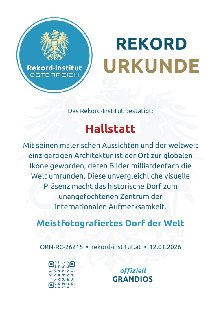 Hallstatt ist eine offiziell grandiose Besonderheit Österreichs mit globaler Strahlkraft. Als visuelles Weltwunder bringt es Menschen aus allen Kulturen zum Staunen und ist ein Juwel des österreichischen Tourismus. Dieser Weltrekord würdigt die unvergleichliche mediale Präsenz eines Ortes, der die Welt seit Generationen fasziniert.