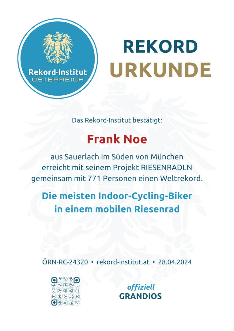 Am 28. April 2024 wurde das Münchner Werksviertel zur Bühne für eine weltweit einzigartige sportliche Vision. Frank Noe, bekannt für seine extremen Alpenüberquerungen, initiierte das „RIESENRADLN“ und verwandelte das „Umadum“-Riesenrad in das höchste Indoor-Cycling-Studio der Welt. Dieser Weltrekord würdigt eine logistische Pionierleistung, die Sport, Technik und Gemeinschaft auf eine neue Ebene gehoben hat – buchstäblich bis auf 78 Meter Höhe.