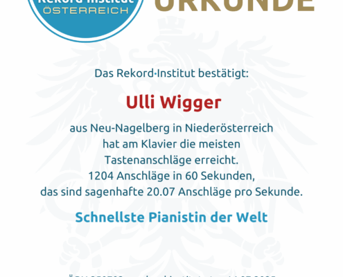 Eine sensationelle Demonstration von Geschwindigkeit und Präzision am Klavier hat Ulli Wigger aus Neu-Nagelberg (NÖ) den offiziellen Titel der schnellsten Pianistin der Welt eingebracht.