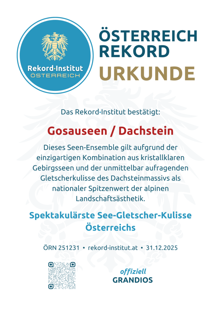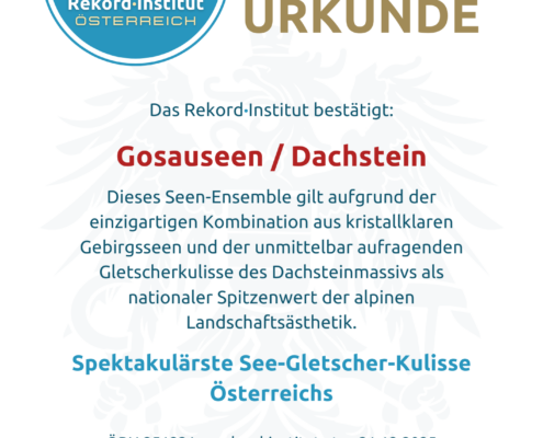 Die Gosauseen beim Dachstein sind ein monumentales Zeugnis der alpinen Schönheit. Der Titel Spektakulärste See-Gletscher-Kulisse Österreichs ehrt nicht nur den weltbekannten Ausblick, sondern das gesamte Ensemble dieser drei außergewöhnlichen Hochgebirgsseen. Damit sind die Gosauseen offiziell eine grandiose Besonderheit unserer Heimat.