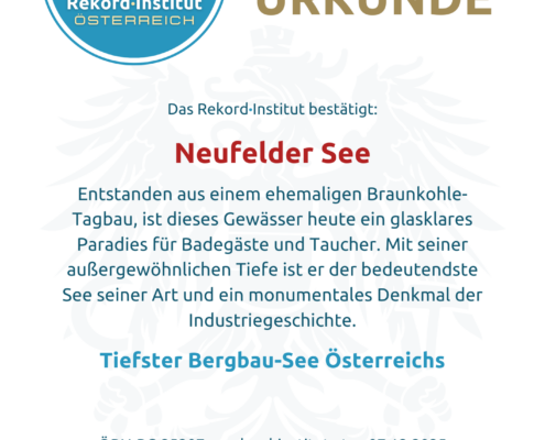 Der Neufelder See ist eine beeindruckende Besonderheit. Der Titel würdigt die außergewöhnliche Tiefe und die historische Bedeutung als ehemaliger Tagbau. Damit ist dieser Ort offiziell eine grandiose Besonderheit unserer Heimat und der tiefste Punkt einer faszinierenden industriellen Vergangenheit.