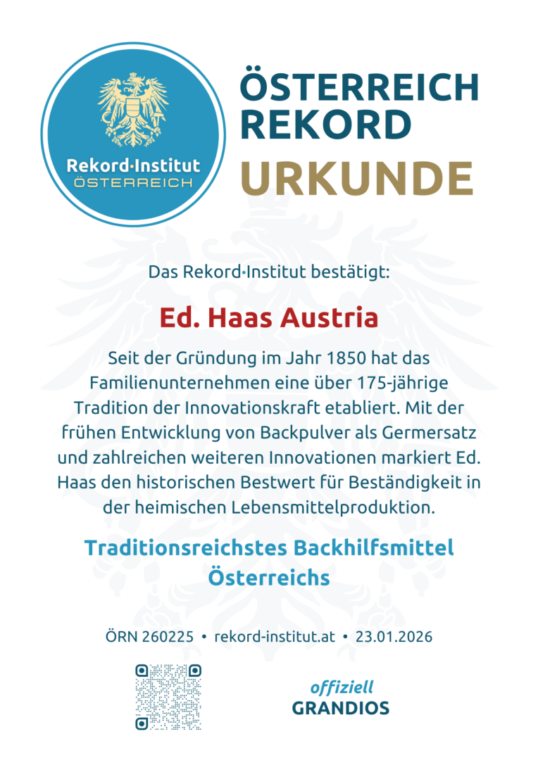 Die über 175-jährige Erfolgsgeschichte von Ed. Haas markiert den historischen Bestwert für die Kontinuität eines Backhilfsmittel-Produzenten in Österreich. Diese beispiellose Beständigkeit über Generationen hinweg macht das Unternehmen und seine Produkte zu einer offiziell grandiosen Besonderheit unserer Genusskultur.