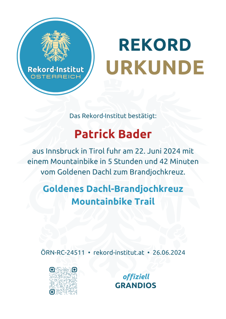 Am 22. Juni 2024 wurde in Innsbruck eine neue Dimension des alpinen Radsports dokumentiert. Patrick aus Innsbruck bewies, dass ein Mountainbike weit mehr ist als nur ein Fahrzeug – es ist ein Begleiter bis zum Gipfel. Vom urbanen Wahrzeichen der Stadt, dem Goldenen Dachl, startete er eine Expedition, die Muskelkraft und mentale Härte in extremem Gelände vereinte. Dieser Weltrekord würdigt eine Pionierleistung in der Kategorie „Bike & Hike“, die neue Maßstäbe für alpine Abenteuer setzt.
